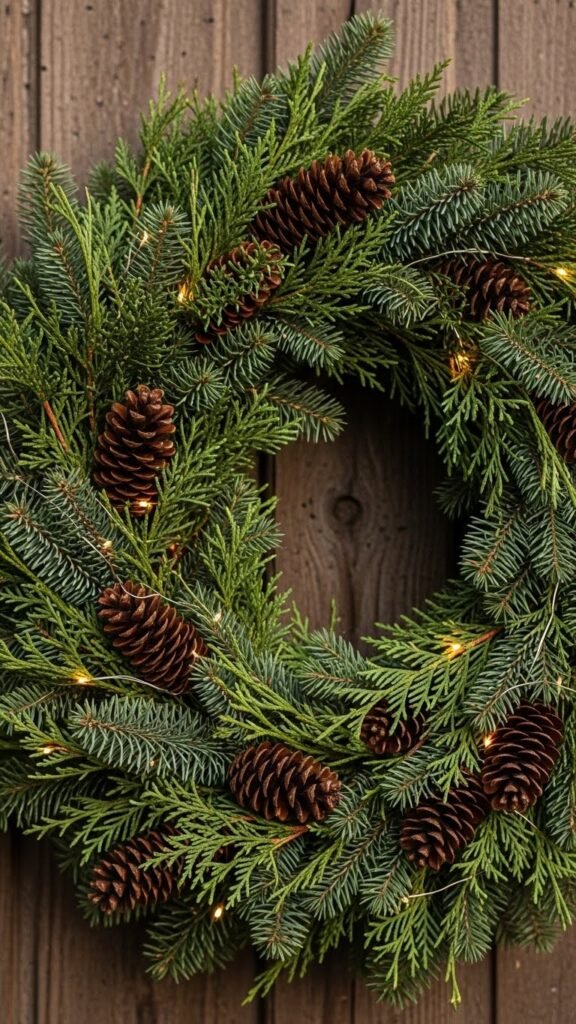 Use a wire wreath form and wrap it with evergreen branches. Add pinecones around the circle for a natural look. Keep the layout loose so it feels warm and simple. You can attach stems using floral wire, which helps the branches stay in place during the season.