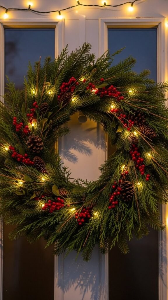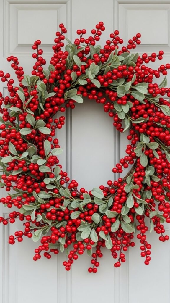 This wreath looks lively during the day and stands out even more at night. You can mix different berry sizes to add depth. If you want a softer look, tuck a few small leaves between the berries. Keep the layout simple so all the red stands out clearly.