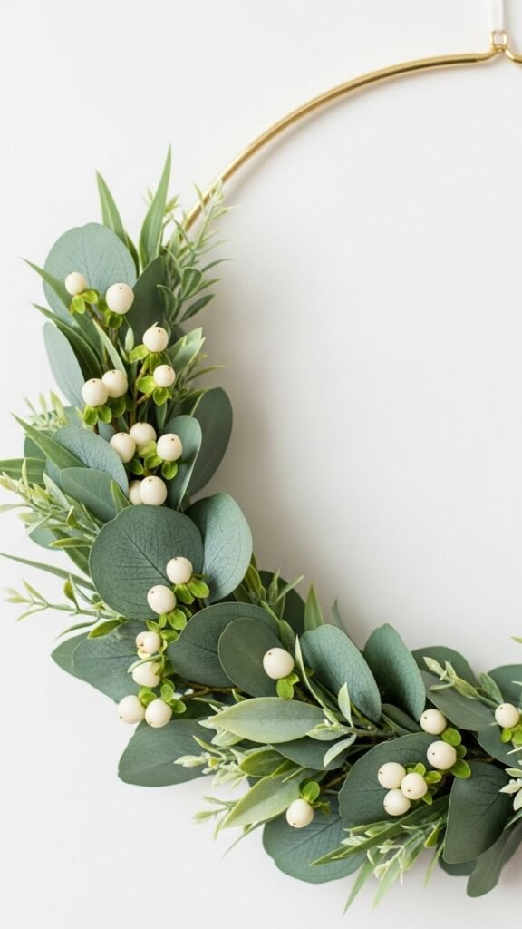 Use a gold or metal hoop as your base. Attach eucalyptus stems to one side only, letting them angle outward for a clean shape. Add a few white berry clusters to brighten the green leaves.